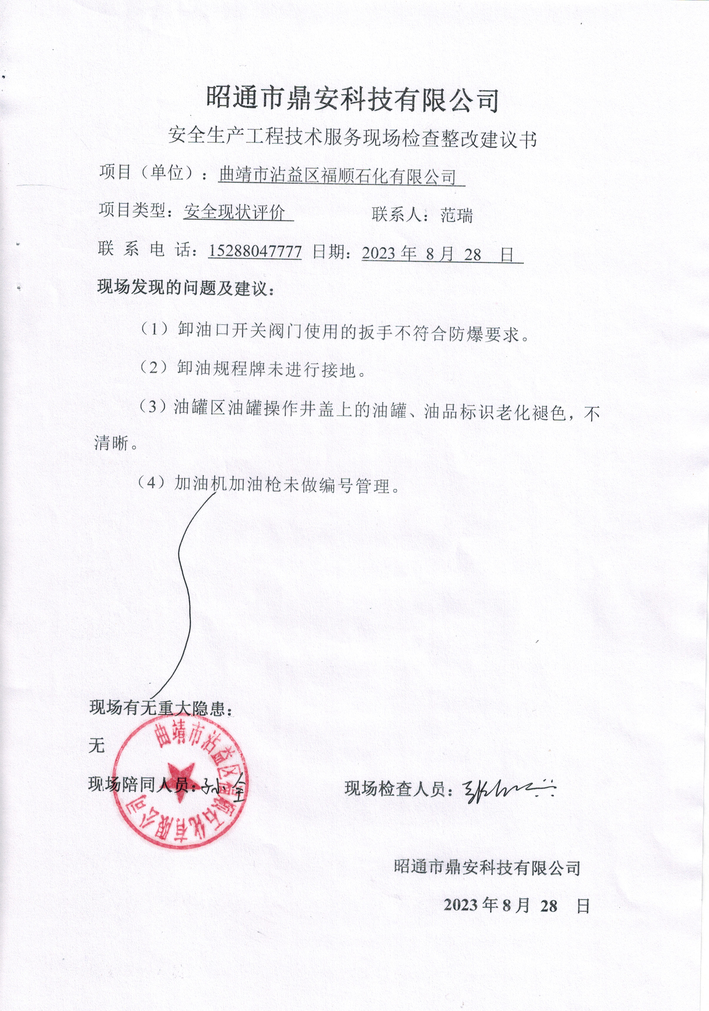 項目名稱 | 曲靖市沾益區(qū)福順石化有限公司安全現(xiàn)狀評價報告 | 合同編號 | DAAPQJ2023-34 | |||||