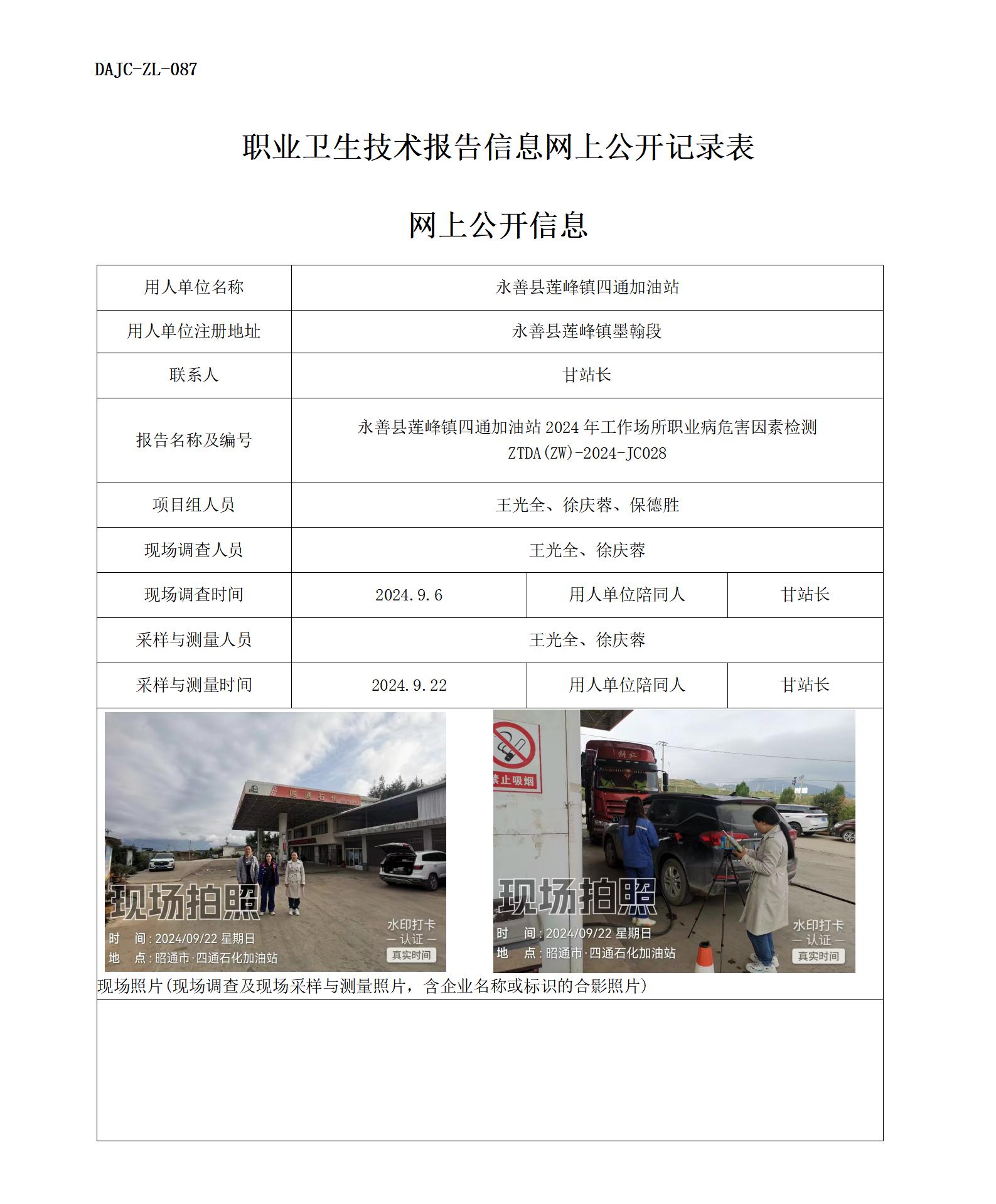 永善縣蓮峰鎮(zhèn)四通加油站2024年工作場所職業(yè)病危害因素檢測(cè) ZTDA(ZW)-2024-JC028